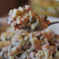Любимый салат россиян появился еще в 1860-х годах. Придумал его француз Люсьен Оливье — владелец и повар московского ресторана «Эрмитаж» на Трубной площади. Классический рецепт включал филе куропаток и рябчиков, телячий язык, раковые шейки или омаров. В центре блюда лежал картофель с корнишонами, а по краям — ломтики яиц. Все это подавалось под соусом «Провансаль». Со временем рецепт упростился. Согласно легенде, один из гостей однажды смешал все ингредиенты, полив их соусом. Месье Оливье был поражен «варварством», но на следующий день подал блюдо именно в таком виде. В СССР салат стал более демократичным: вместо дичи и языка стали использовать вареную колбасу, добавляли морковь и зеленый горошек.