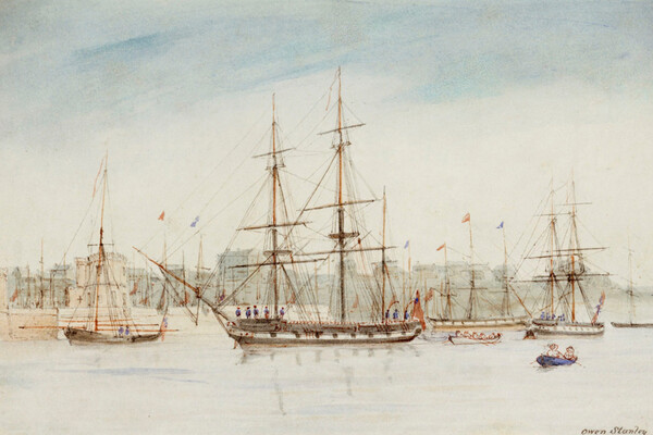 Корабль «Бигль», на котором Дарвин совершил путешествие. Акварель Оуэна Стенли
