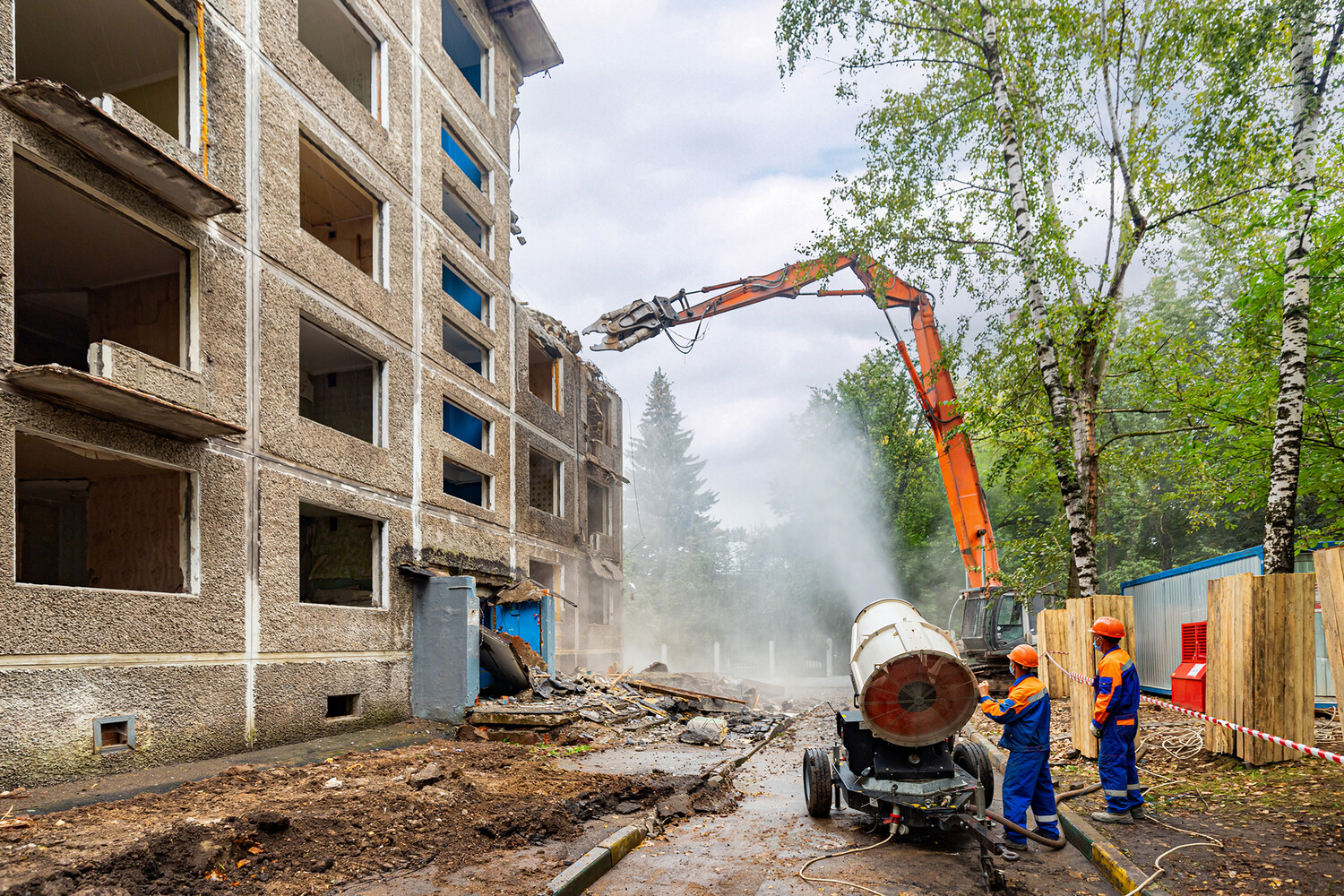 При этом снос здания производится с помощью специализированной техники: экскаватор-разрушитель разрезает каркас гидравлическими ножницами, а строительную пыль сбивают с помощью гидропушек, которые распыляют воду под большим давлением. При этом специальные короба защищают деревья от повреждений. А защиту граждан обеспечивают ограждения стройплощадок.