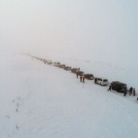 Остальным повезло меньше. Минтранс обещал также рано утром выпустить из поселка легковые машины и туристические автобусы — но колонна так никуда и не доехала. Поднялась метель, дорогу снова замело. К 15:30 ведомство призналось, что довести машины до города невозможно, и вновь вернуло всех в Териберку.