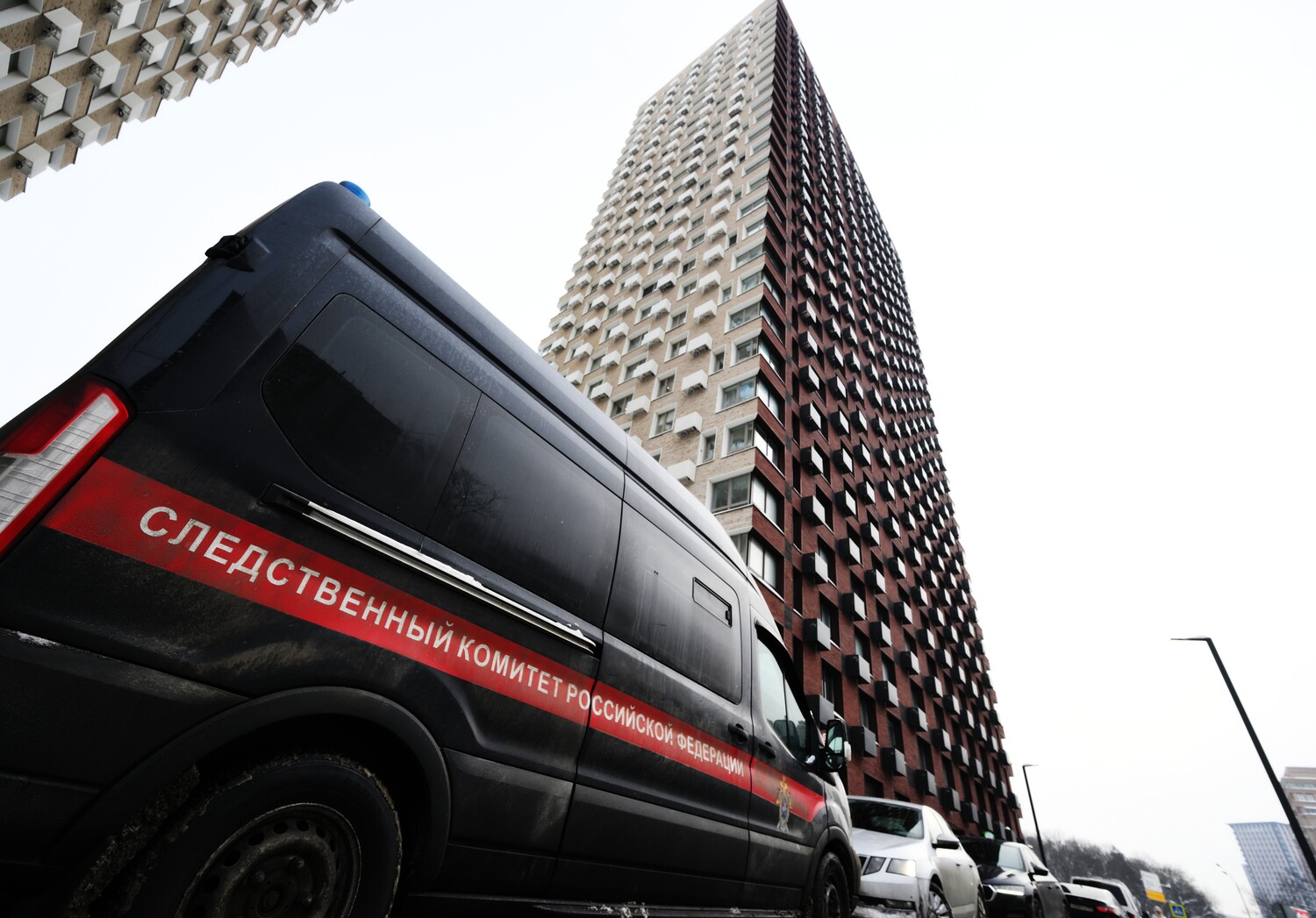 Автомобиль Следственного комитета РФ у дома, где было совершено покушение на убийство генерала Минобороны РФ Владимира Алексеева, 6 февраля 2026 года