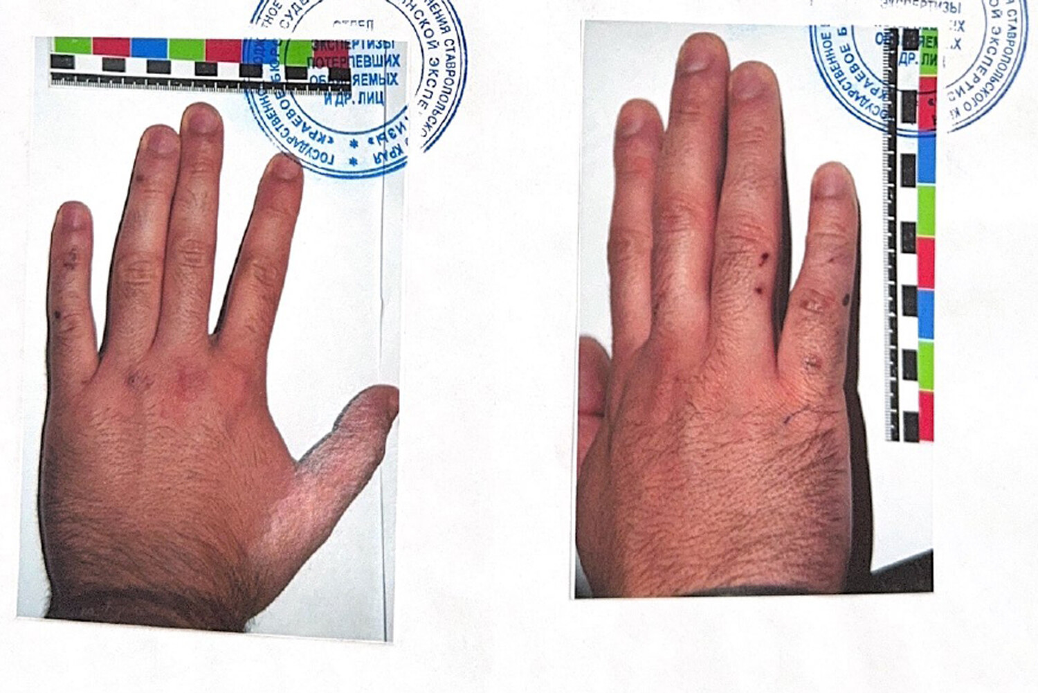В выводах экспертов указано, что мозоли на предплечьях образовались из-за трения о наручники, а множественные ожоги повторяют форму и расположение электродов и вызваны контактом с «цилиндрическим металлическим предметом», напоминающим «вилку».