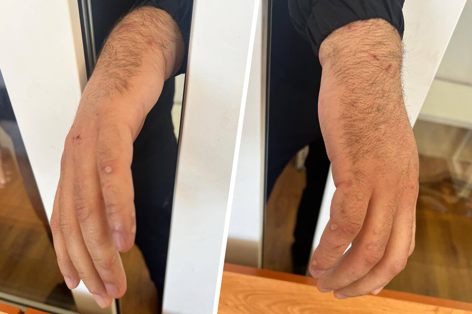 «Это такие клеммы соединяли сюда и сюда, — рассказывает Кюльбяков, показывая на руки. — Потом я слышал, как они друг другу говорят: «Прожгли, прикипело». Смазали влажной салфеткой, потом опять. Но волдыри все равно вылезли».