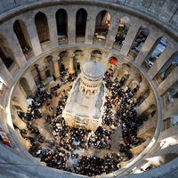Делегация России вошла в иерусалимский храм Гроба Господня, где в Кувуклии – часовне над ложем Гроба Господня - в Великую субботу накануне Пасхи появляется Благодатный огонь, который делегация получит и доставит в Москву.