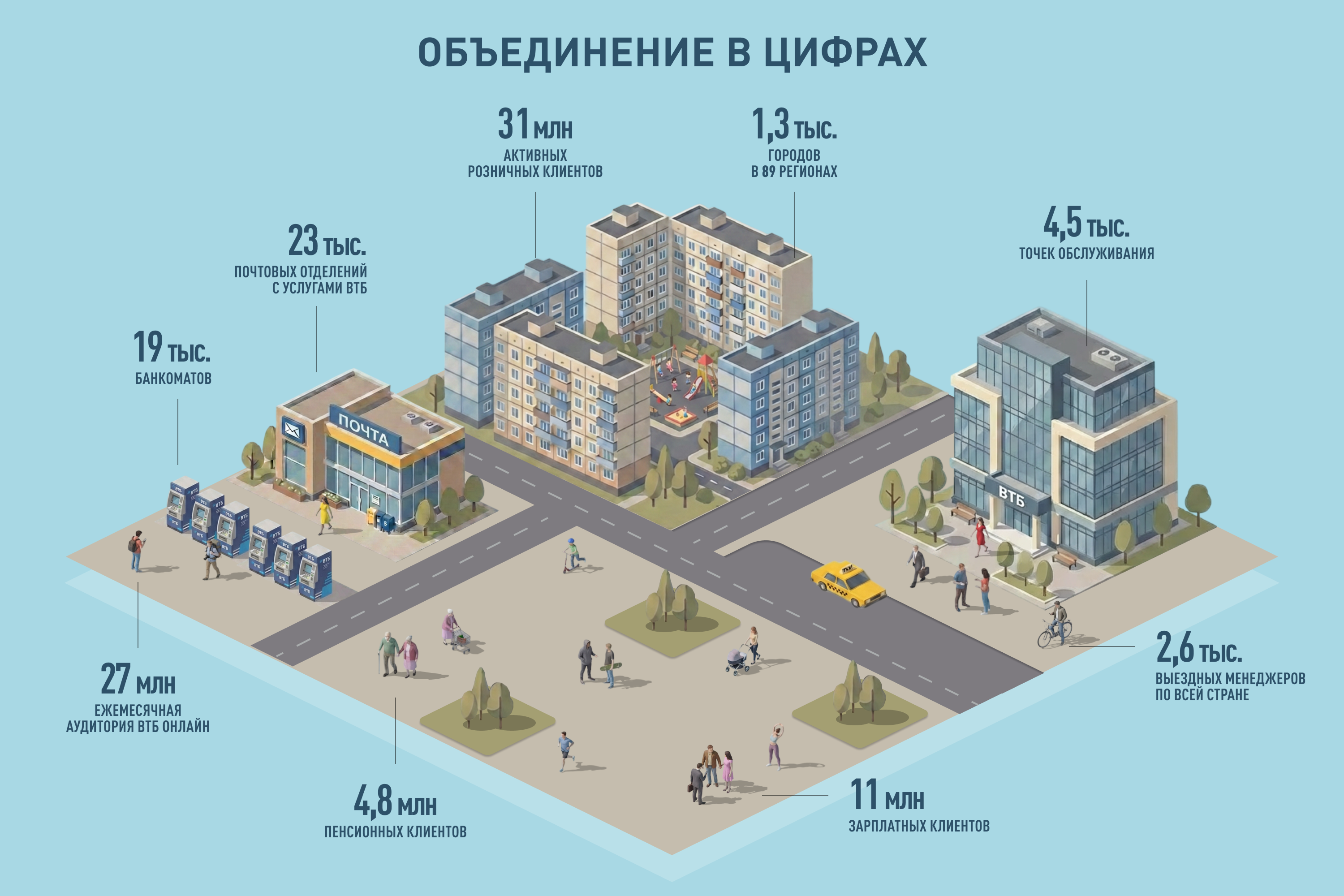 Именно эту проблему — так называемые «финансовые пустыни» — и решает интеграция «Почта Банка». В результате объединения ВТБ стал присутствовать еще в 683 населенных пунктах, где раньше его не было — в основном в малых городах и сельской местности. Новая вывеска появилась на 2,2 тыс. точках обслуживания, большая часть из которых работает на базе отделений «Почты России».