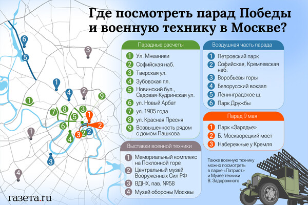 Попасть на Красную площадь 9 Мая можно только по приглашению. Но в столице есть и другие локации, где можно увидеть парад: