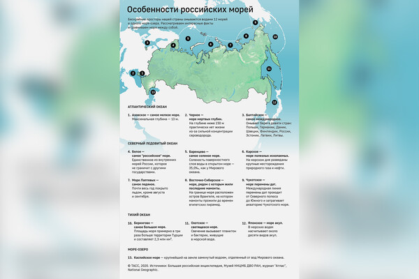 Считается, что территорию России омывает 13 морей, относящихся к бассейнам трех различных океанов — Атлантического, Тихого и Северного Ледовитого.
