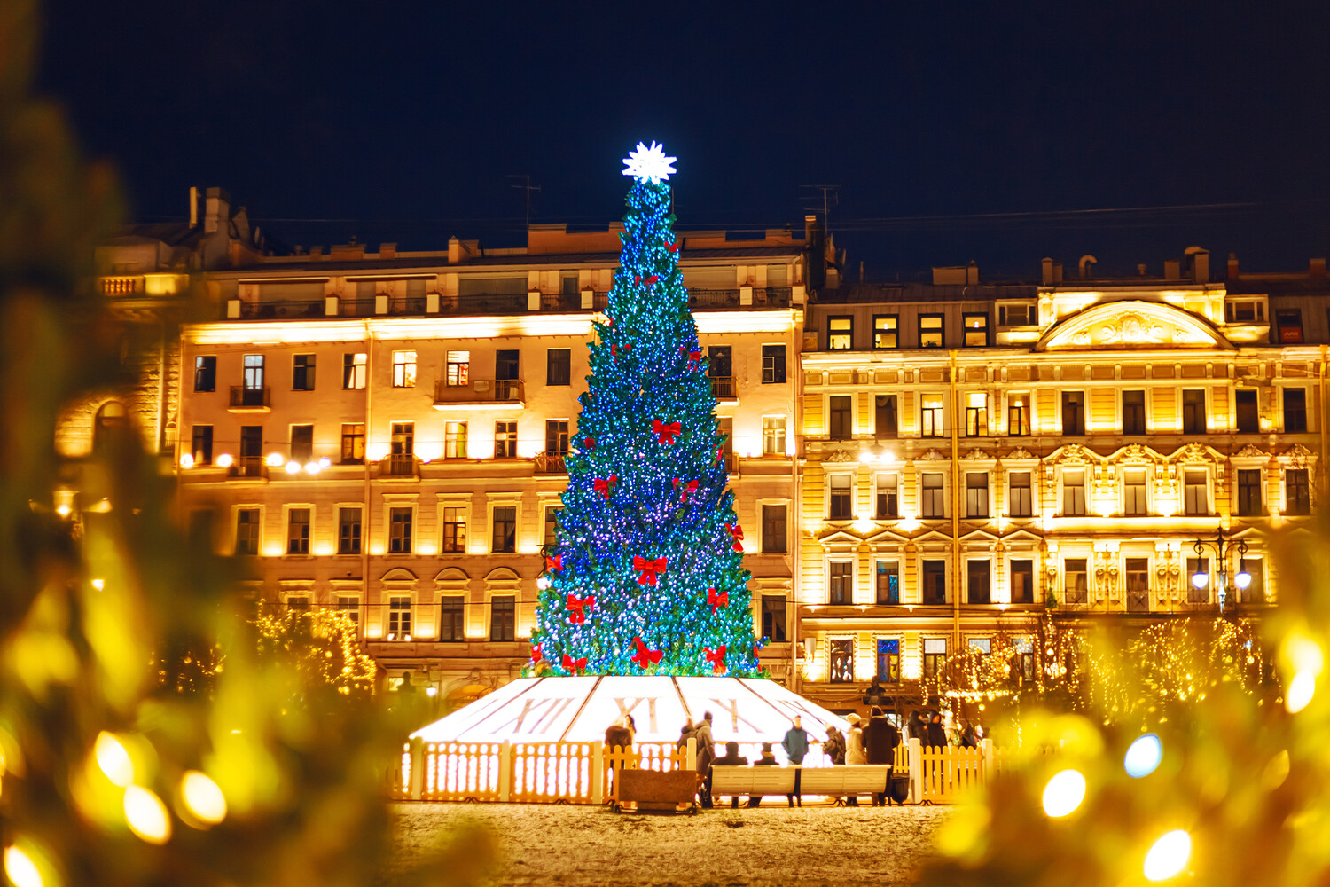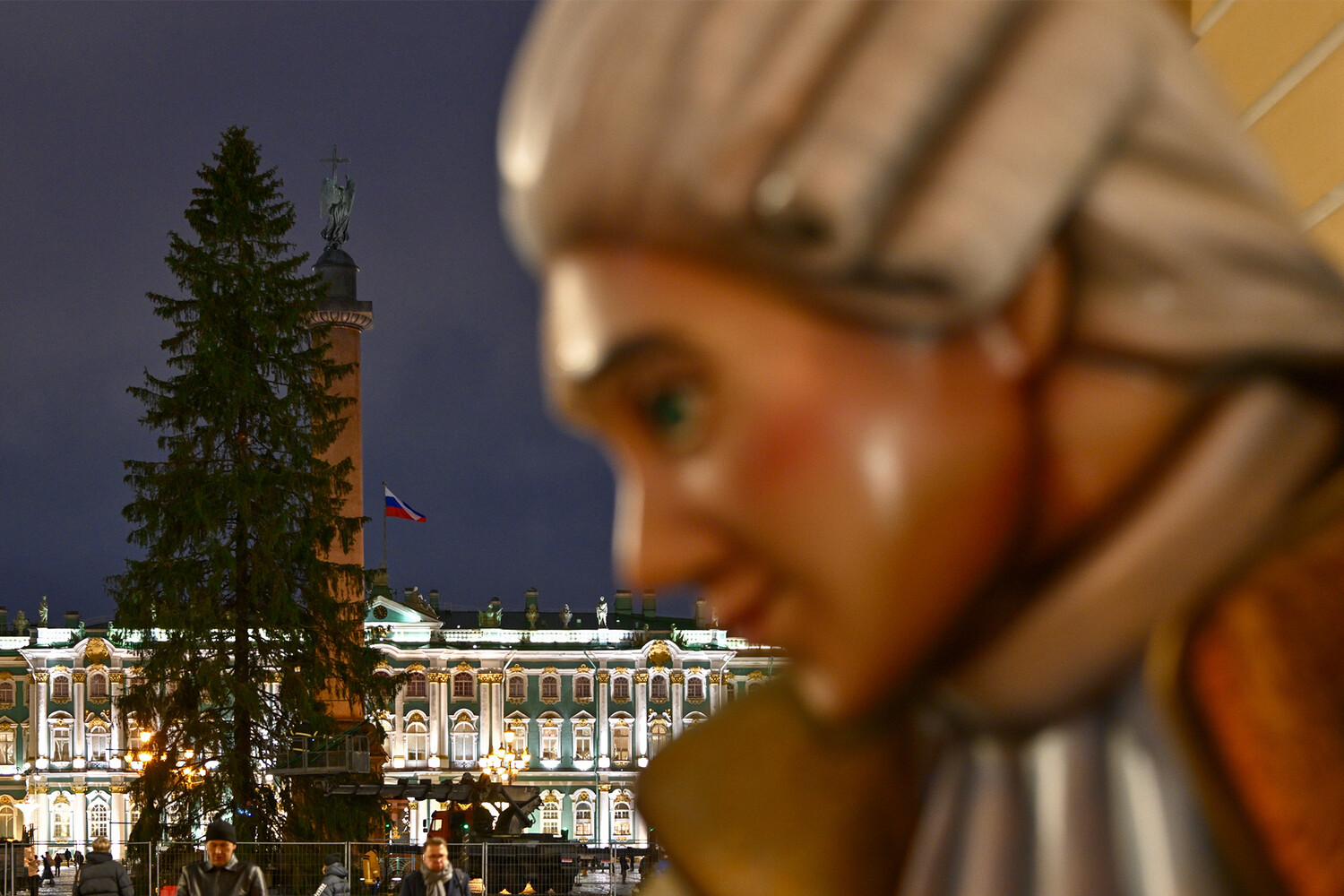 В центре главной площади Санкт-Петербурга — новогодняя ель высотой более 30 метров, с обхватом кроны 4,8 метра, привезенная из Копорского лесничества Ленинградской области.