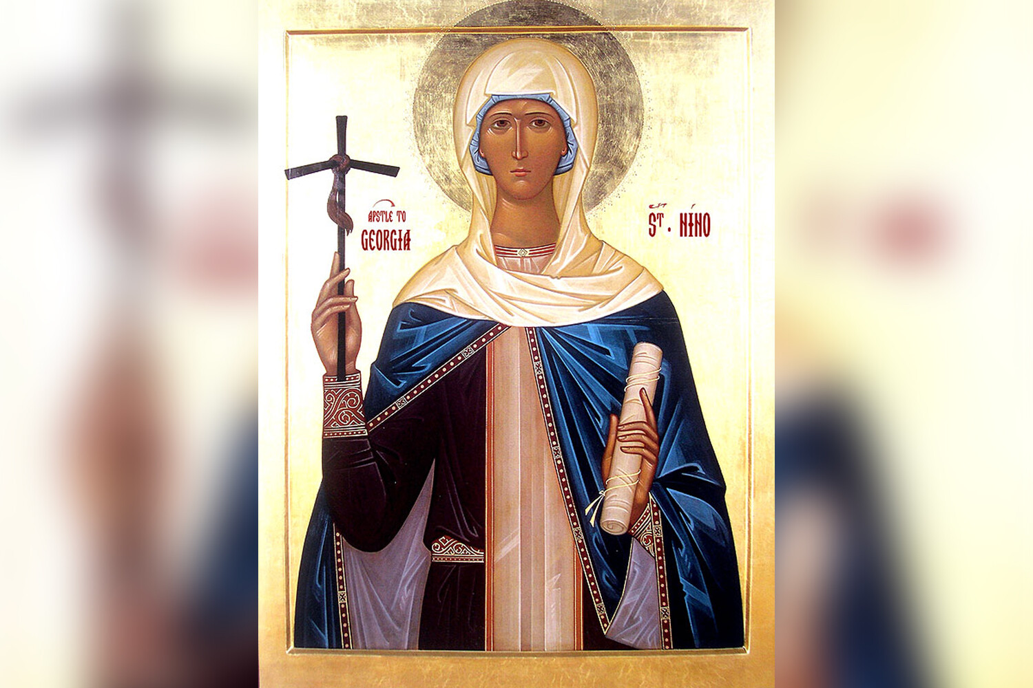 Святая Нина жила в IV веке. Согласно церковному преданию, она была родом из Каппадокии, а по более поздним редакциям жития — племянницей Иерусалимского патриарха. С юных лет Нина прониклась христианской верой и всем сердцем возлюбила Бога. Ее отец, отказавшись от общения с миром, стал пустынником, а мать посвятила себя Церкви. Воспитанием святой Нины занялась благочестивая старица. Женщина много рассказывала ей об Иверии (современная Грузия), и Нина загорелась желанием принести в эту языческую страну веру Христову. Вскоре в видении ей явилась Богородица, вручившая девушке крест из виноградных лоз.