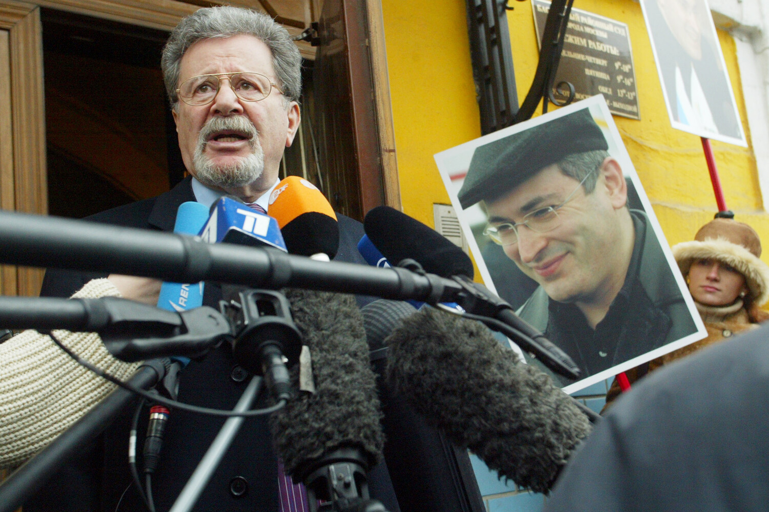Российский адвокат Михаила Ходорковского (признан в РФ иностранным агентом и внесен в список террористов и экстремистов) Генрих Падва отвечает на вопросы журналистов у здания Басманного суда столицы
