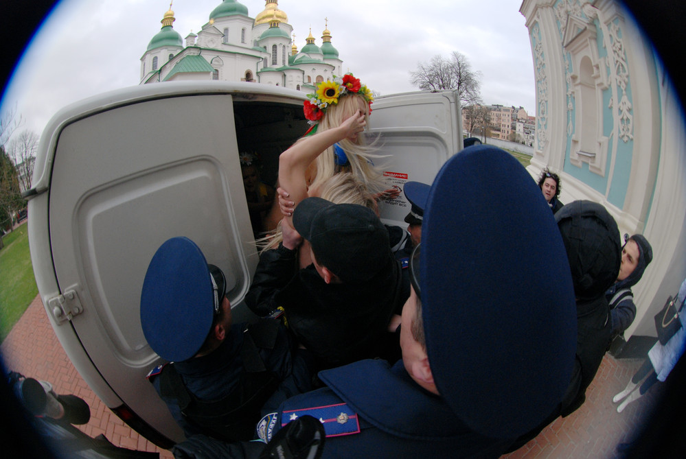 В столичном главке милиции сообщили, что в субботу около 16.00 по Оболонскому проспекту ехал наряд патрульно-постовой службы и заметил трех «разгуливающих оголенными» девушек и парня с фотоаппаратом. Сотрудники милиции пытались сделать им замечания в связи с неподобающим видом, однако они не реагировали. В отношении девушек составлен протокол по ст. 172 Кодекса Украины об административных правонарушениях («Мелкое хулиганство»). В отношении молодого человека протокол составлен по ст. 185 («Неповиновение требованиям сотрудников правоохранительных органов»).