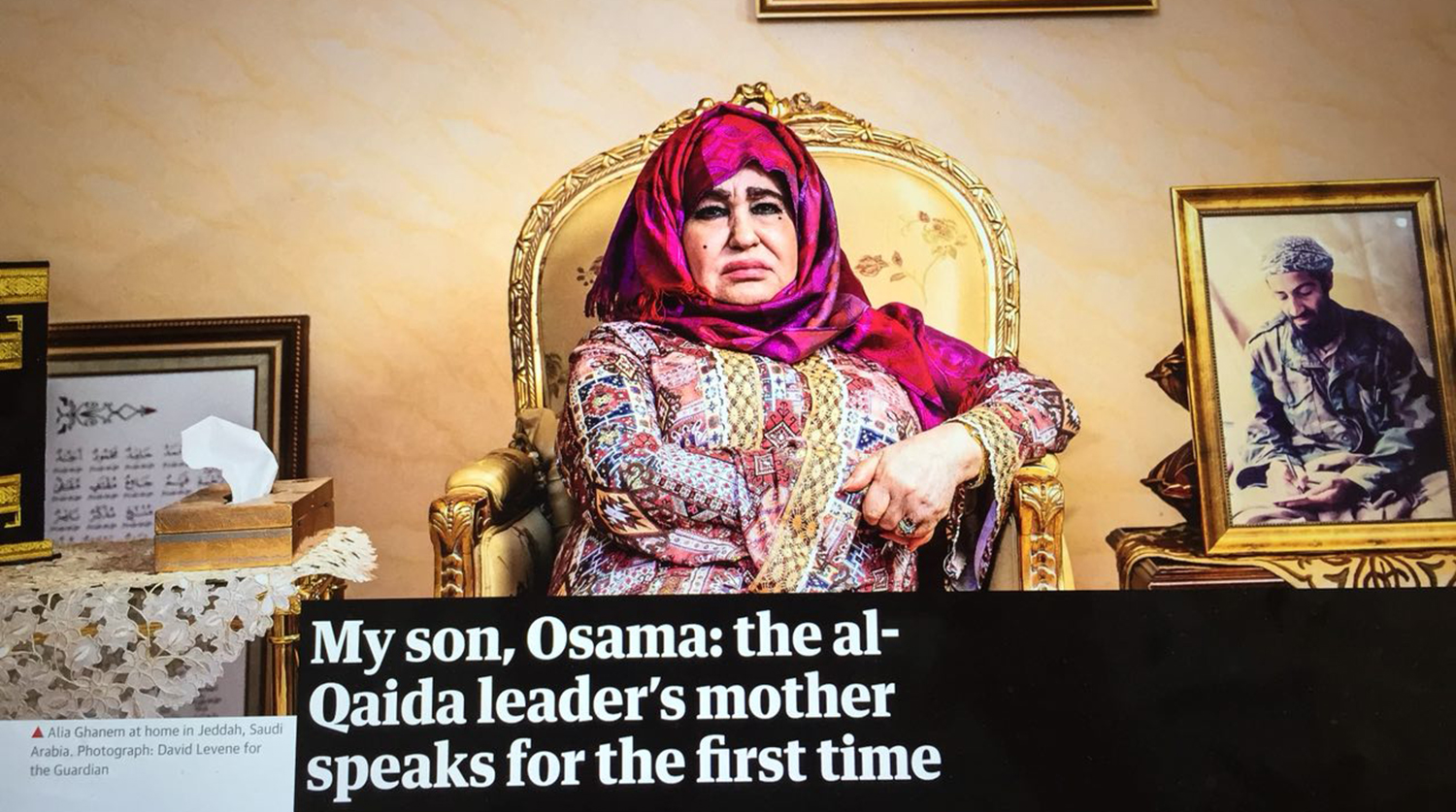 Мать основателя и лидера террористической группировки «Аль-Каида» (организация запрещена в России) Усамы бен Ладена Алия Ганем дала интервью британской газете The Guardian. В настоящее время вместе с ней живут братья Усамы бен Ладена — Ахмад и Хассан и второй муж — Мохаммед Аль-Аттас в особняке на территории города Джидда, на западе Саудовской Аравии.