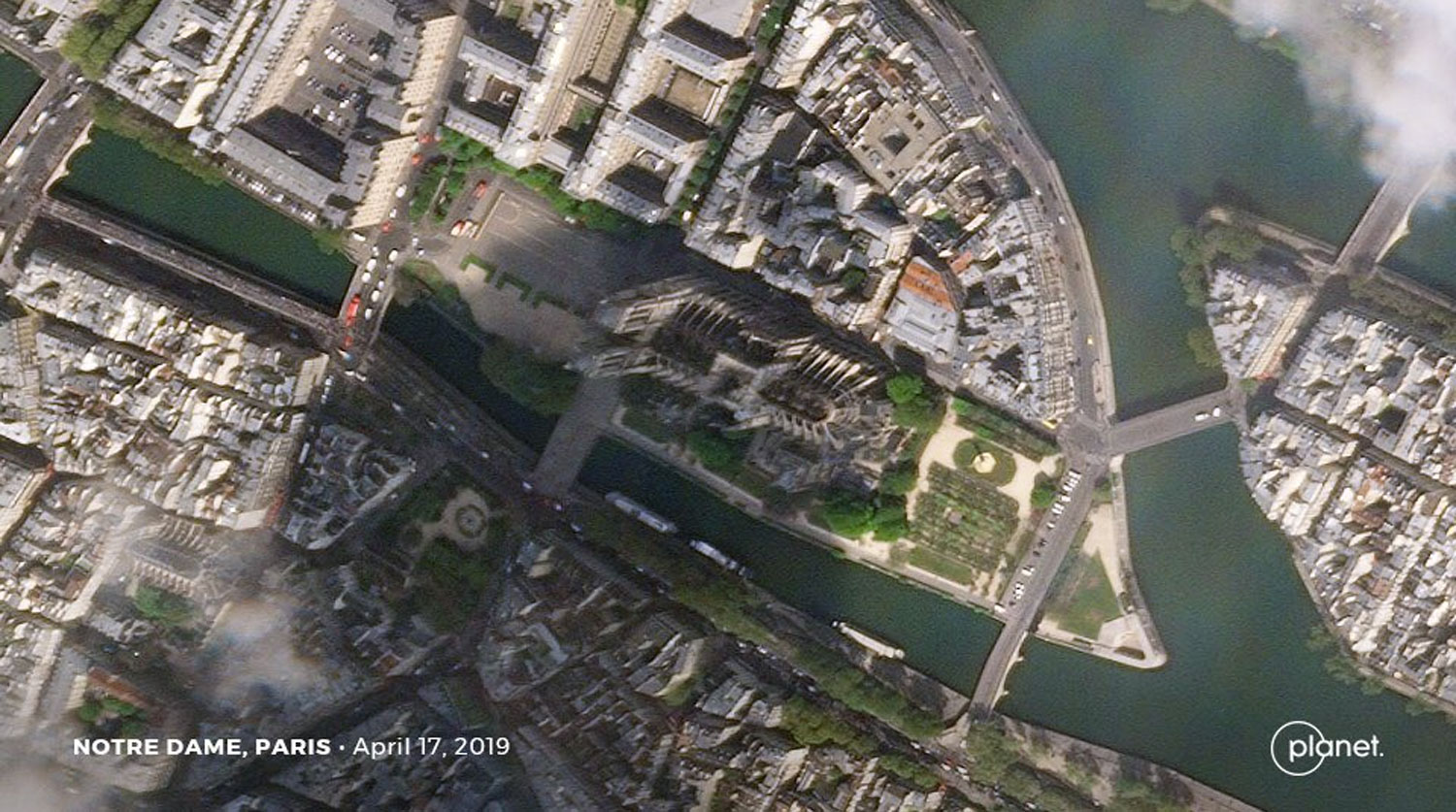 «Наши коллеги из PlanetLabs (американская компания-оператор спутников дистанционного зондирования Земли) сделали то, что мы считаем первым публичным спутниковым снимком Нотр-Дам после пожара», — говорится в сообщении.