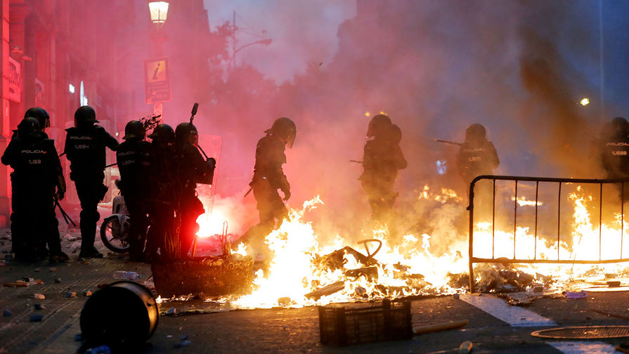 Полиция Барселоны применила резиновые пули, чтобы остановить протестующих на улицах города, передает РИА «Новости».