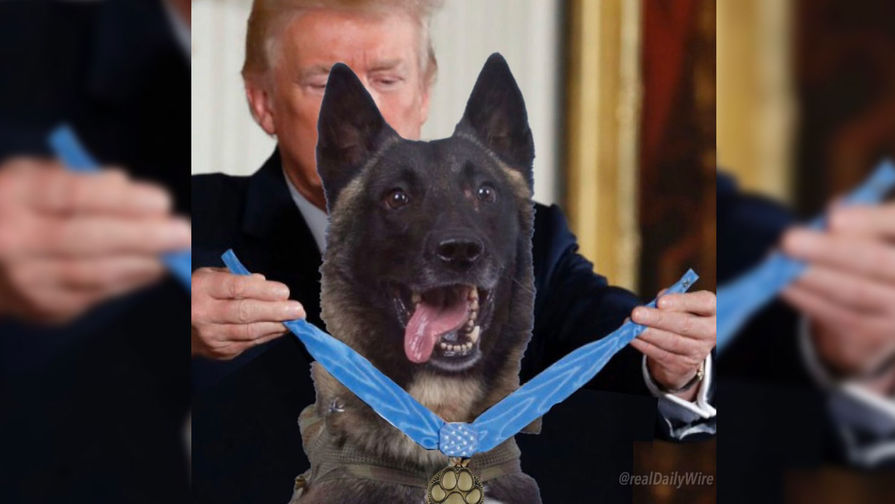 Президент США Дональд Трамп в своем Twitter разместил фотоколлаж, на котором он награждает пса, участвовавшего в ликвидации главаря ИГ (организация запрещена в России) Абу Бакра аль-Багдади.