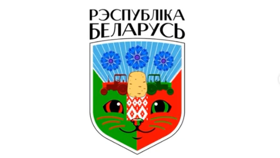 В дизайнерском варианте гербового щита поместили различные клише о стране. Так, на фоне флага страны изображена мордочка кота, картошка, два трактора красного и зеленого цвета и три василька.