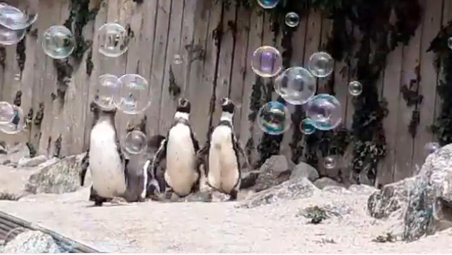 В британском зоопарке подарили скучающим пингвинам машину для мыльных пузырей