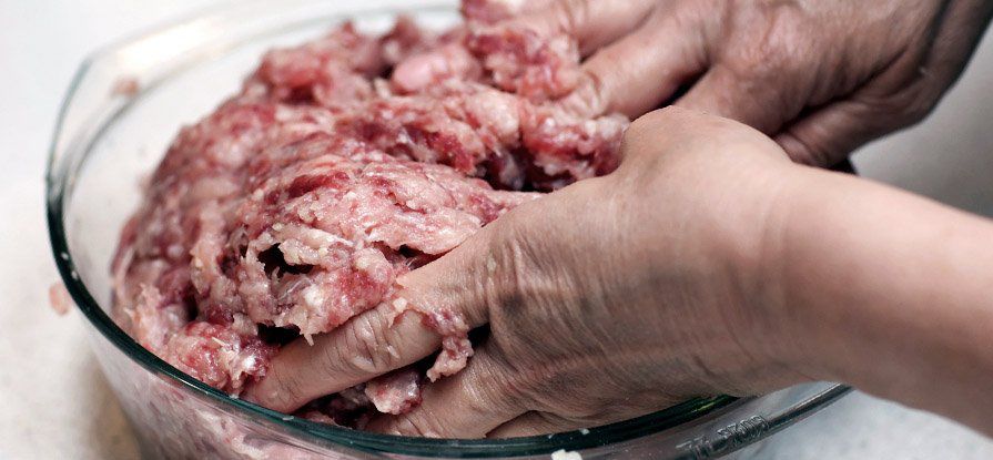 Для приготовления котлетного фарша историк кулинарии посоветовал хорошо вымешать фарш, после чего выбить оттуда воздух, кидая несколько раз шлепками фаршевый комок в миску.