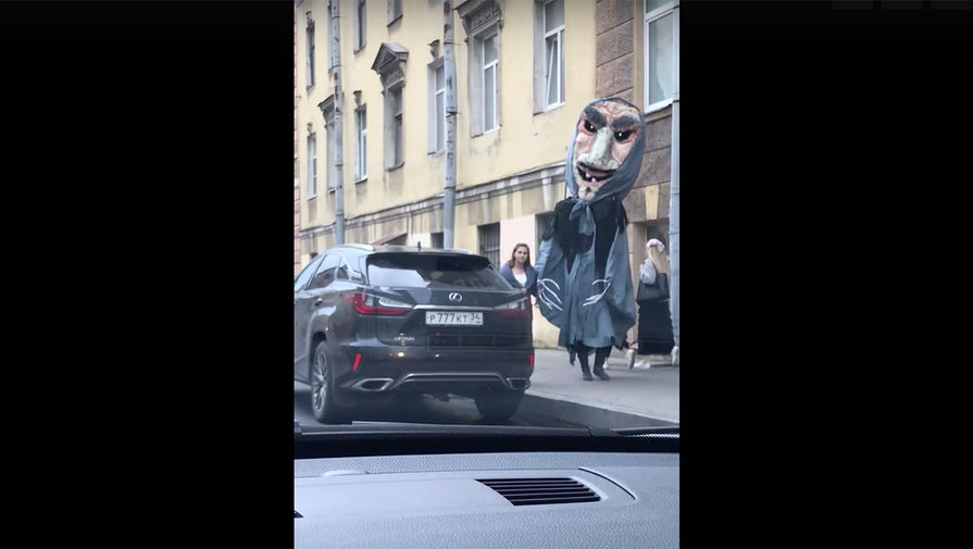 На кадрах видно, как по тротуару идет человек в костюме Смерти с огромной головой. Сказочного героя ведет под руку девушка.