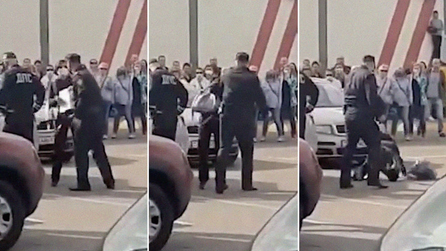 Милиционер поднял руку на женщину во время словесной перепалки горожан с силовиками. После того, как он ударил женщину, на него набросились демонстранты. Спустя минуту майора отвели в микроавтобус без номеров.
