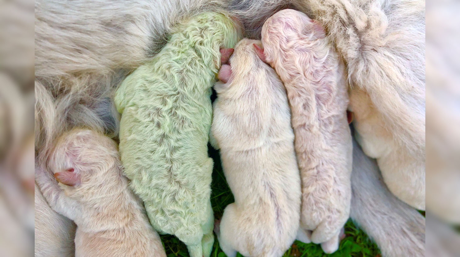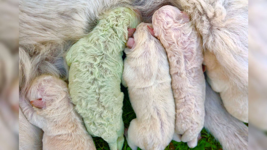 Такое происходит, когда щенок со светлой шерстью в утробе матери контактирует с зеленым пигментом, называемым биливердином. Отмечается, что скоро мех щенка станет обычного цвета.