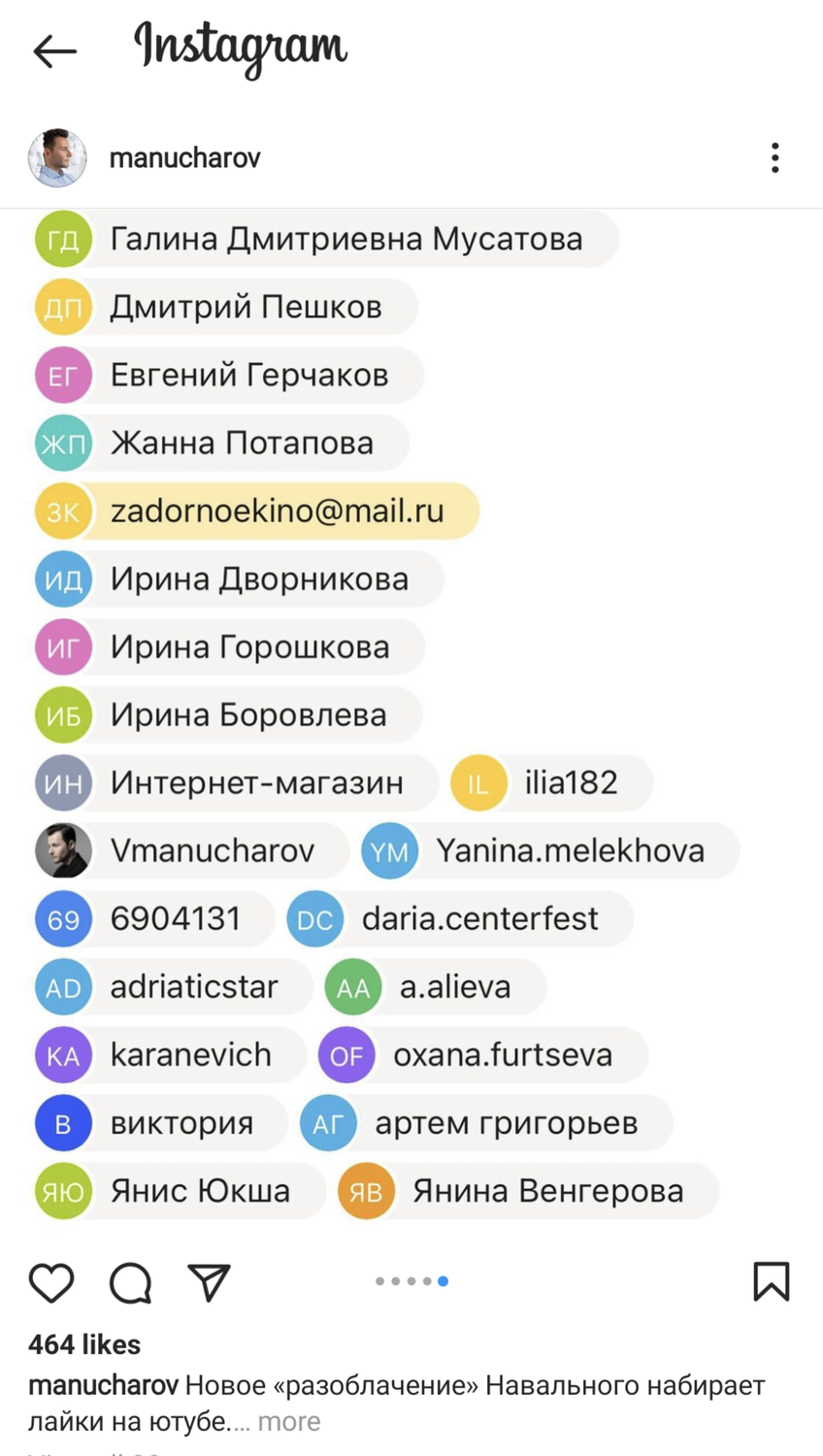 «Новое «разоблачение» Навального набирает лайки на ютубе, - пишет Манучаров в инстаграме. — Но давайте откровенно. Солидные просмотры, наверняка, обрадуют скромную редакцию ФБК (организация включена Минюстом в список иноагентов)».