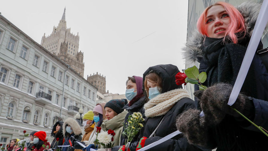 Также у памятника находятся представители правоохранительных органов. Акция проводится в поддержку, в том числе Юлии Навальной, которая улетела ранее на этой неделе в Германию.