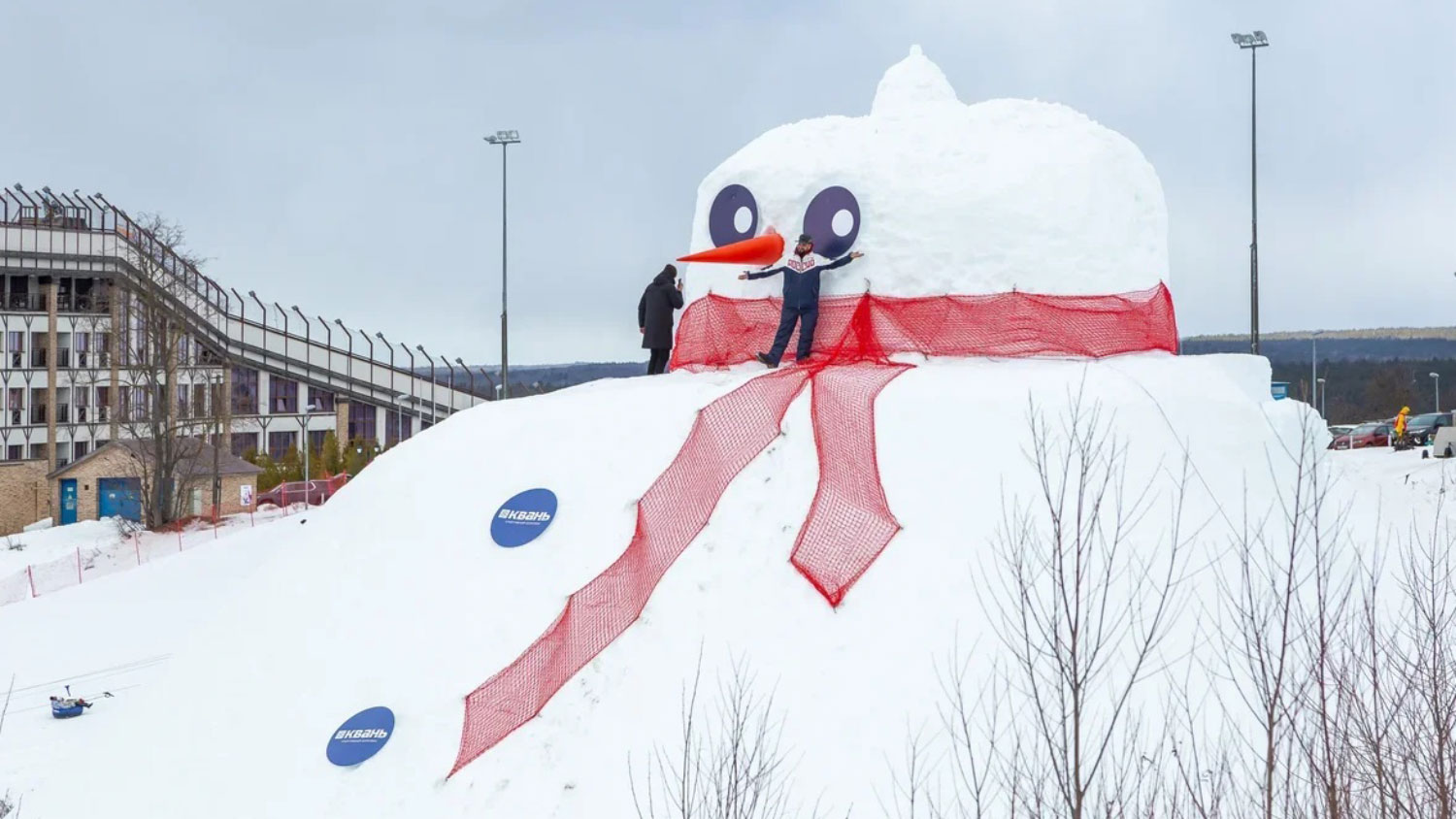 Отмечается, что фигура весит около тысячи тонн. Снеговика назвали Кваня. Его шею перевязали красной ленточкой. Многие жители и гости Калуги забираются на голову фигуры.