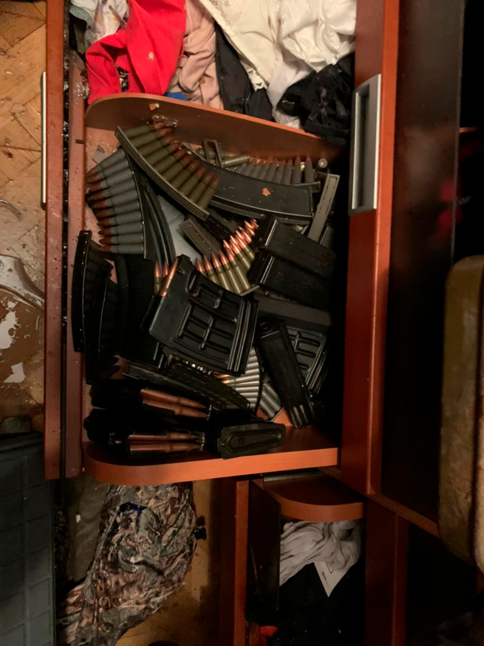 «К настоящему времени изъято 29 единиц автоматического оружия, 4 пистолета, более 100 тысяч патронов, подсчет которых еще не окончен, а также 1 шашка с запалом, 2 гранаты страйкбольные, 1 муляж гранаты, а также иные предметы, имеющие значение для расследования уголовного дела», — сообщает Врадий.