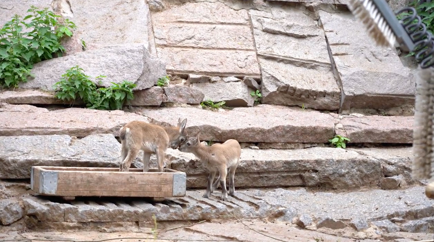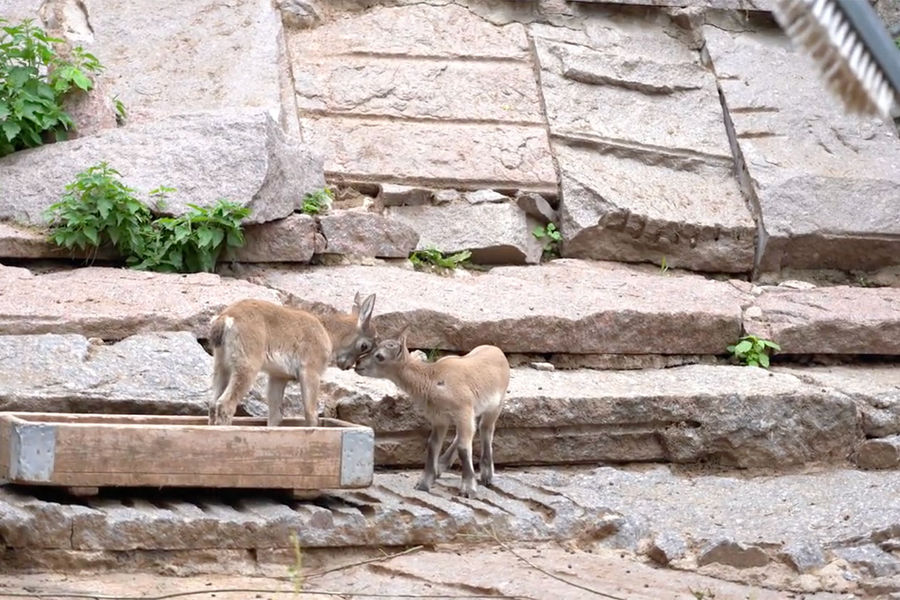 Детеныши пока преимущественно питаются материнским молоком, но уже начинают пробовать взрослую еду: ветки и листья. На кадрах видно, как они активно скачут на горке зоопарка.