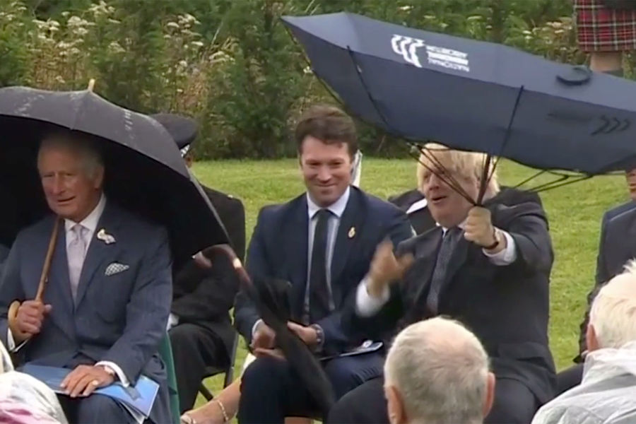 Церемония проходила под дождем, и присутствующие, включая Джонсона и Чарльза, открыли зонты. Когда лить перестало, премьер-министр решил свернуть зонт, но его вывернул наизнанку сильный порыв ветра. Наследник британской короны, увидев его тщетные попытки починить зонт, рассмеялся.
