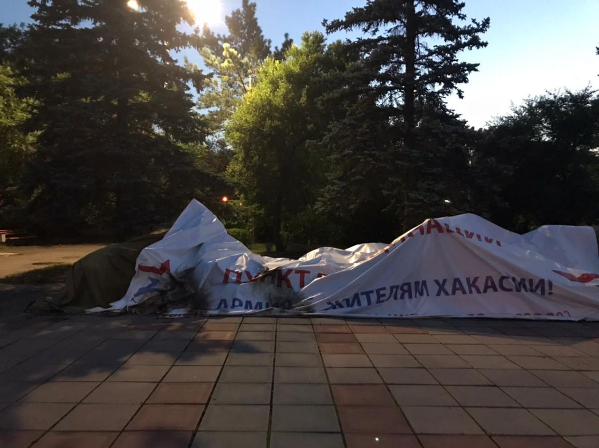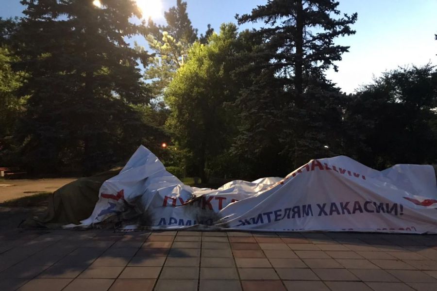 На Первомайской площади в городе Абакан, Республика Хакасия, мужчина поджег палатку, в которой находился пункт вакцинации министерства обороны. Об этом сообщается на сайте правительства региона.