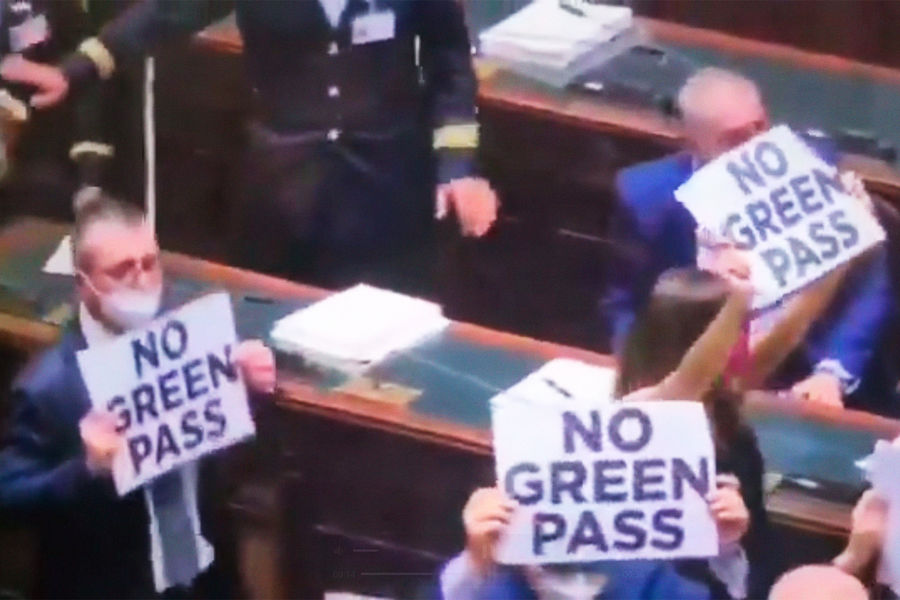 Когда в нижней палате парламента должно было начаться голосование по поводу декрета о мерах борьбы с пандемией, группа депутатов покинула свои места и подняла плакаты с надписью — «Нет грин-пассу» (речь о сертификате о вакцинации от COVID-19). Вскоре их призвали к порядку.
