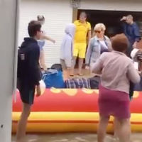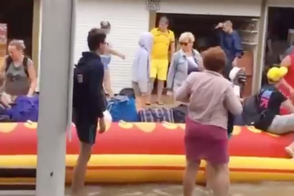В Анапе на затопленной улице люди спасаются от воды на надувном аттракционе «Морской дракон». Об этом сообщает Telegram-канал Life Shot.