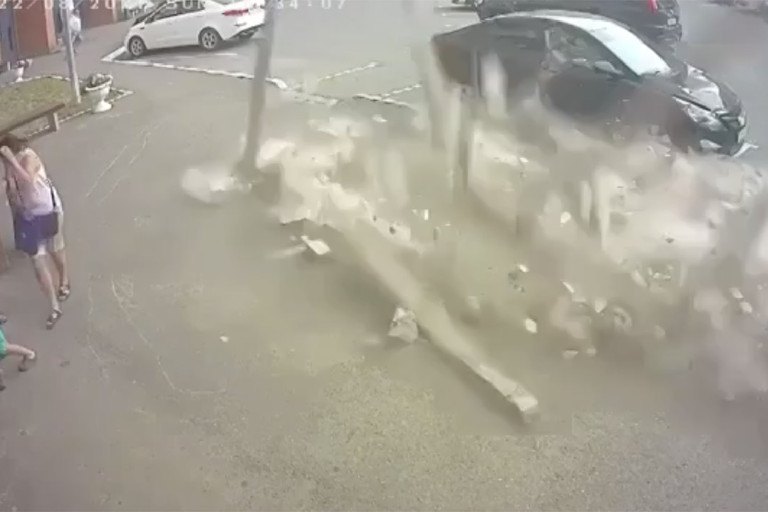 На опубликованных кадрах с места происшествия видно, что кирпичная стена обрушилась позади женщины с ребенком. Женщина не пострадала, а ребенку потребовалась медицинская помощь.