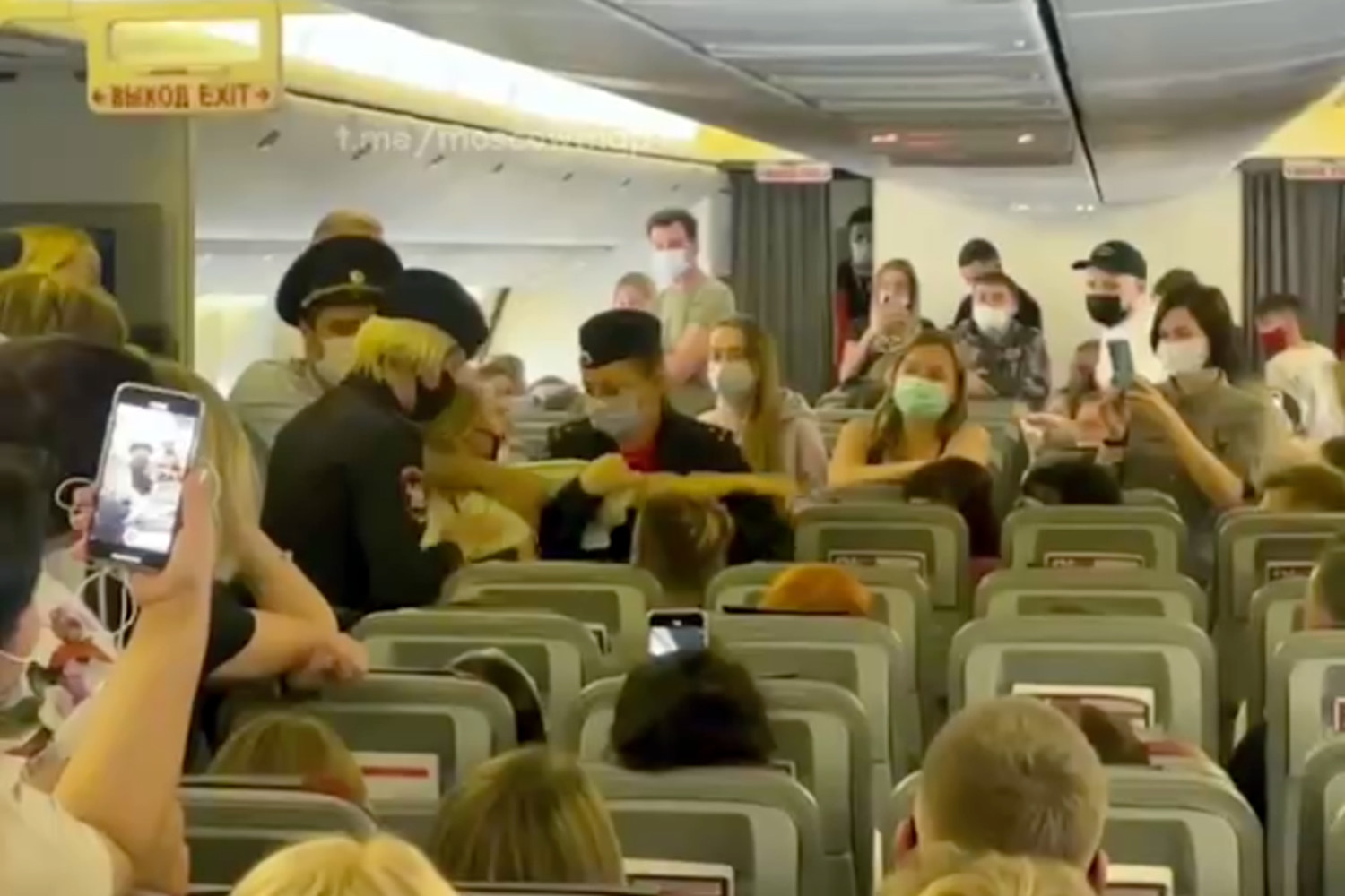 Некоторые из присутствующих на борту начали предлагать свою помощь, когда женщина категорически отказывалась уходить из салона лайнера.