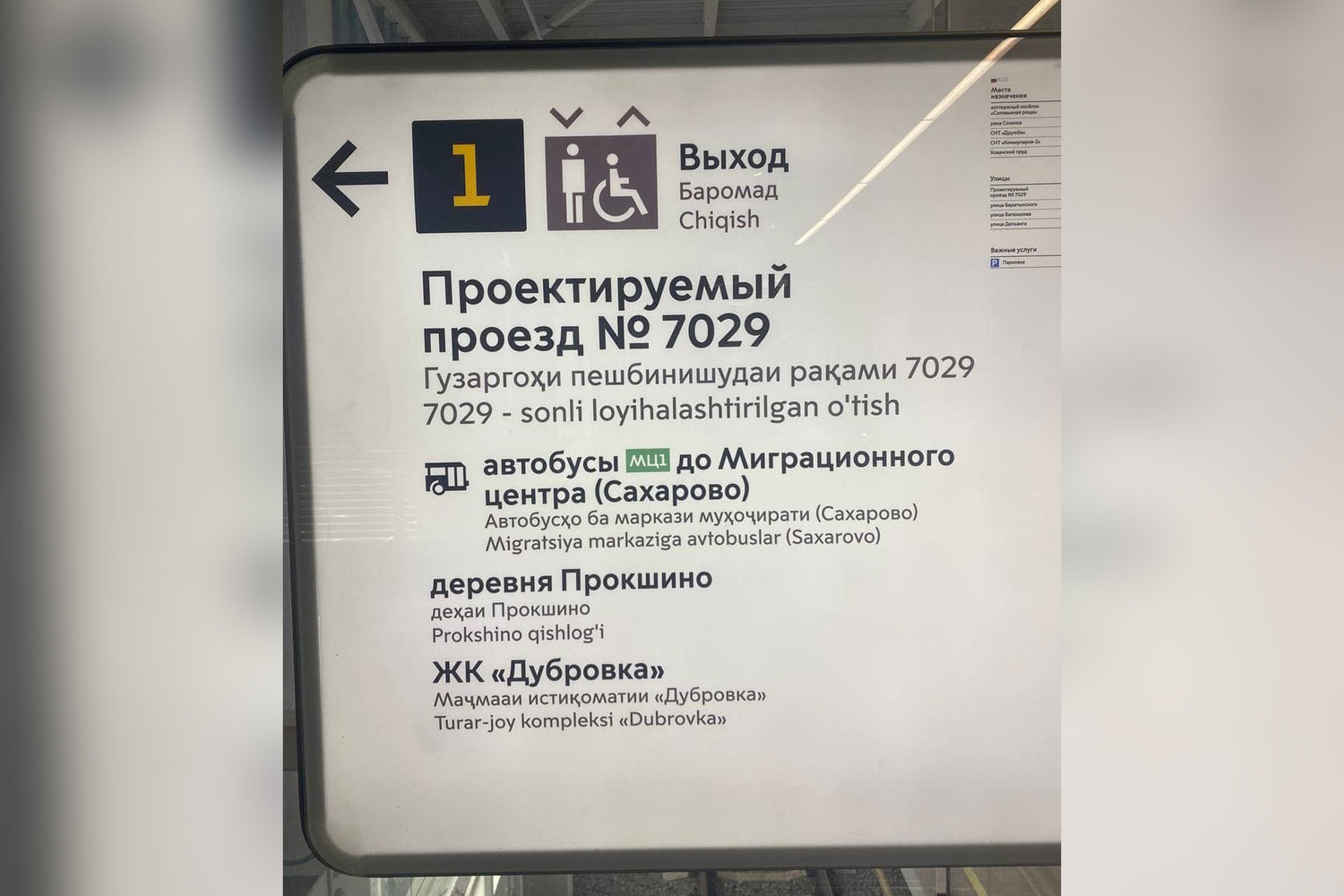 Указатели на таджикском и узбекском языках появились на станции «Лесопарковая» Бутовской линии московского метрополитена. Об этом сообщается в Telegram-канале РБК.