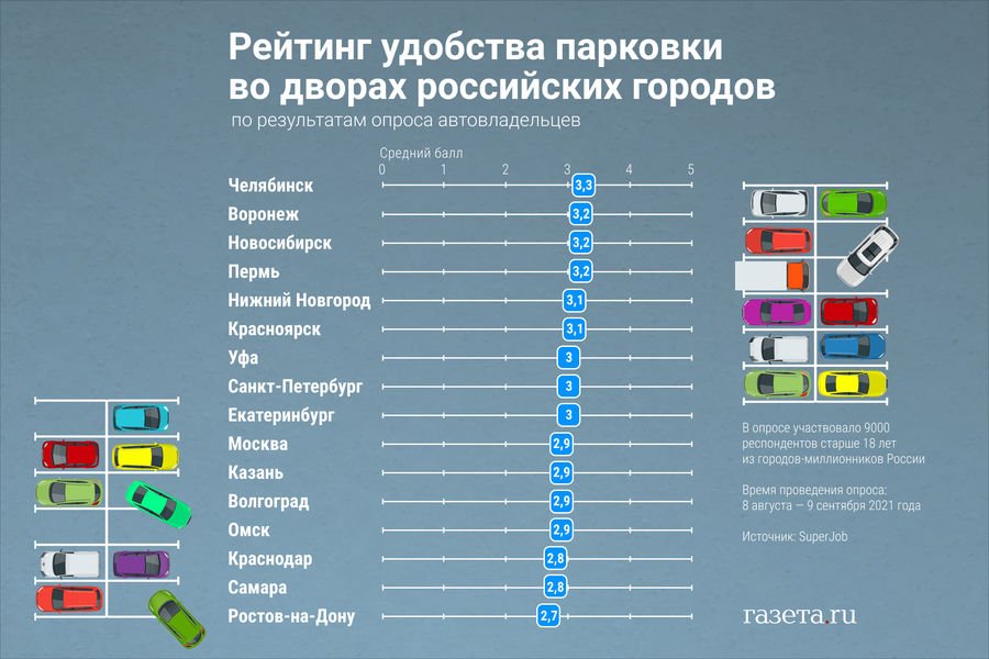 Москва оказалась в одном ряду с Омском, Казанью и Волгоградом – 2.9 балла жители этих городов поставили парковкам во дворах за невозможность найти место для машины возле дома после 18.00. В Самаре и Краснодаре ситуация на одну десятую балла ниже, причем здесь автолюбители хотели бы перепланировать пространство в кварталах советской застройки, чтобы увеличить число машиномест. Замыкает рейтинг Ростов-на-Дону: ему поставили 2,7 балла. Именно этот город стал чемпионом по количеству крайне неудовлетворительных оценок – 23% опрошенных.