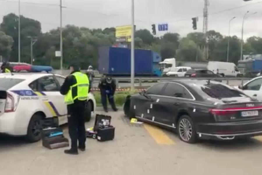 На кадрах видно, как на месте инцидента работают правоохранительные органы. На машине Шефира наклеены стикеры, которые, предположительно, показывают места прохождения пуль.