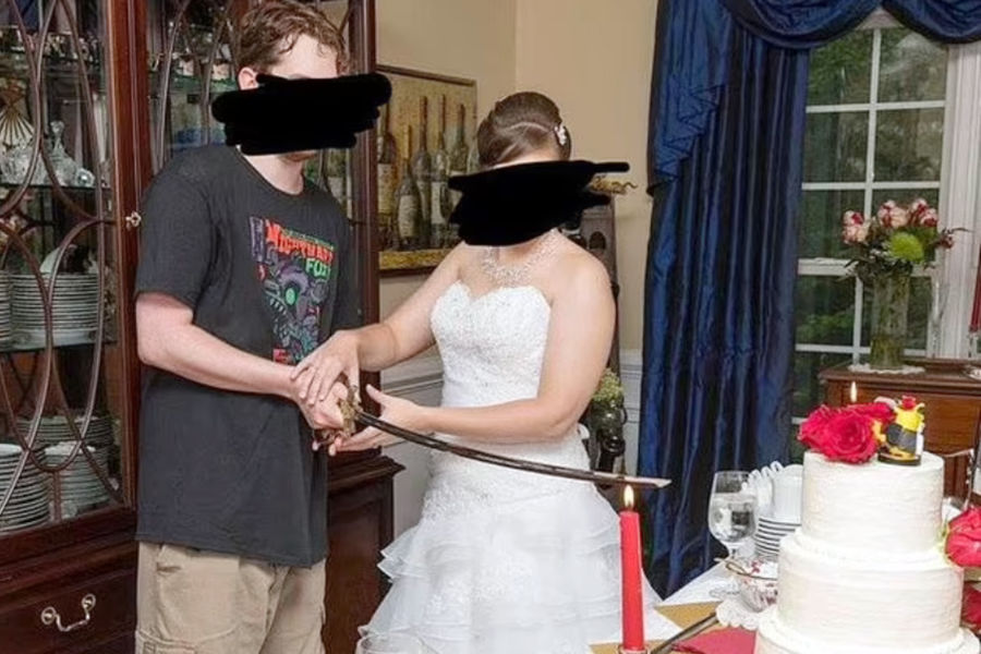 На фотографии изображены жених и невеста, и, в то время, как невеста стоит в красивой праздничной фате, то жених одет так, как будто это — обычный день. Причем, супруги держат церемониальный меч.