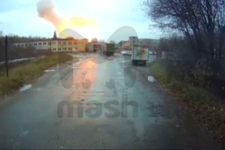 На видео показано, как автомобиль движется в направлении цеха по производству пороха, когда происходит взрыв и клубы дыма поднимаются вверх. Судя по ролику, цех расположен в лесном массиве.