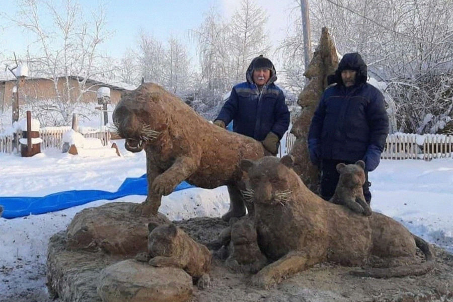 Якутский скульптор Михаил Боппосов, который создает скульптуры из коровьего навоза, слепил семейство тигров — символов наступающего 2022 года. Об этом сообщает издание News.Ykt.Ru.