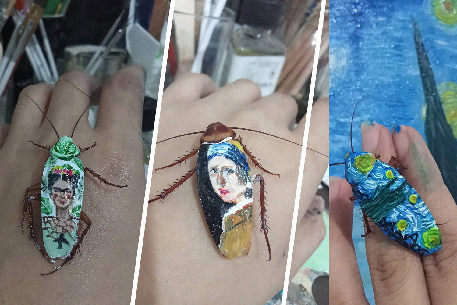Художница с Филиппин удивила соцсети своими рисунками, сделанными на мертвых тараканах, сообщает Indian Express.