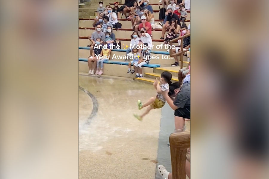 По информации СМИ, женщина вместе с ребенком пришла в сингапурский зоопарк на водное шоу. Они заняли место в первом ряду, но мать, видимо, не ожидала, что представление закончится тем, что морской лев, двигая ластами, начнет поливать их водой.