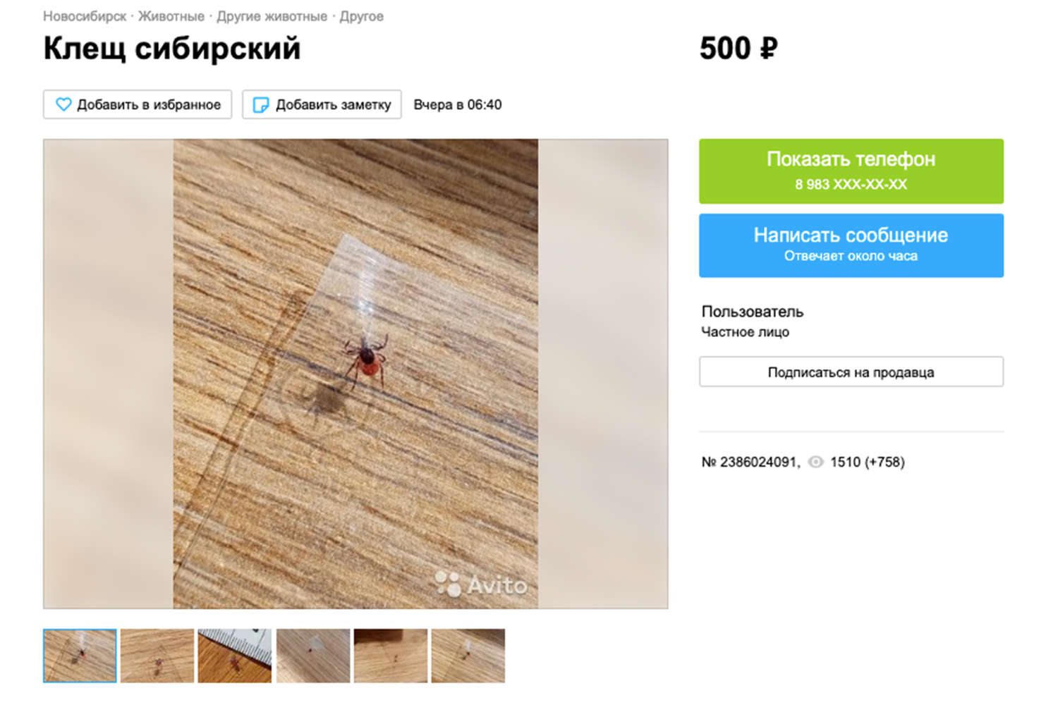 В Новосибирске девушка решила продать клеща за 500 рублей на Avito, чтобы покупатель мог использовать его в научных целях.