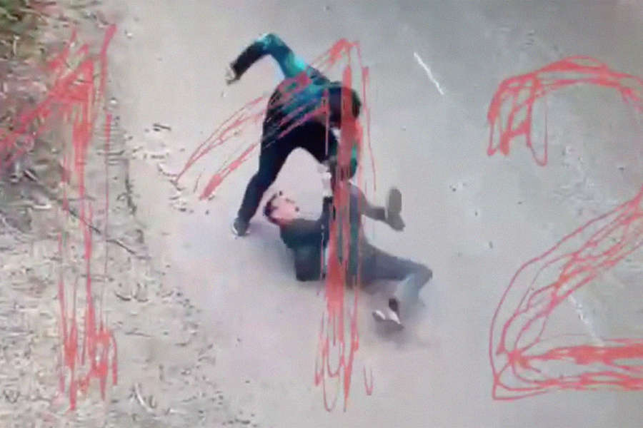 На кадрах видно, как погибший бежит от нападавшего, спотыкается и падает. Убийца подбегает к нему и наносит несколько ножевых ранений.