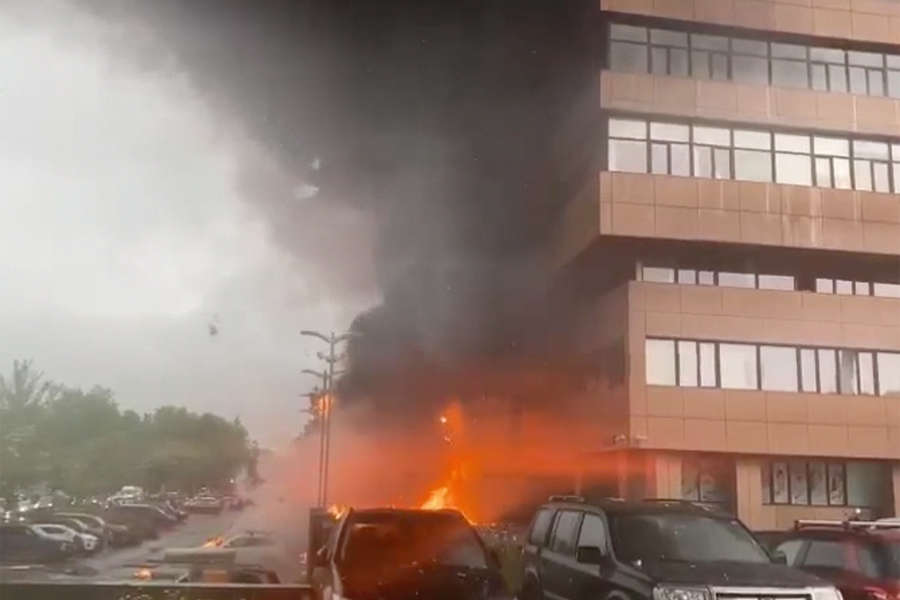 Как сообщает Baza, в здании загорелась обшивка центрального входа.