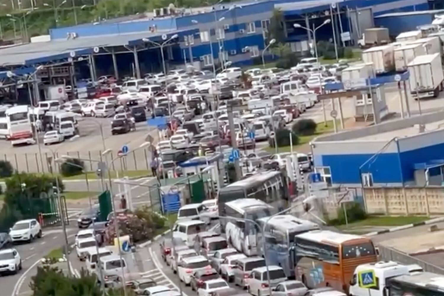 На кадрах показано, как многокилометровая линия из машин зигзагом выстроилась на дороге в ожидании пересечь границу.