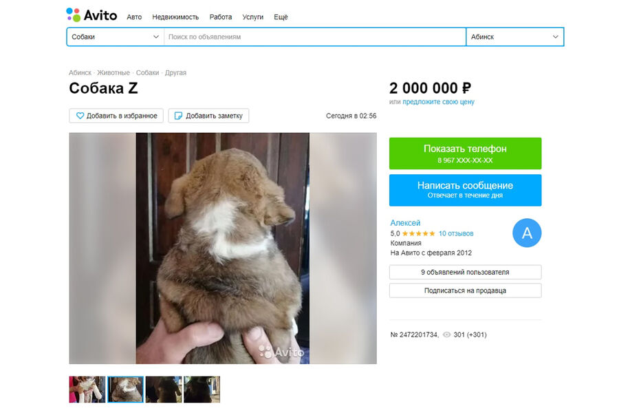 На сайте «Авито» появились объявления о продаже щенков с рисунками в виде буквы Z на шерсти. Автор одного из объявлений, в котором животное продается за 2 миллиона рублей, Алексей рассказал «Газете.Ru», что цена «шуточная», а само объявление — эксперимент, который мужчина решил провести «в связи с обстановкой».