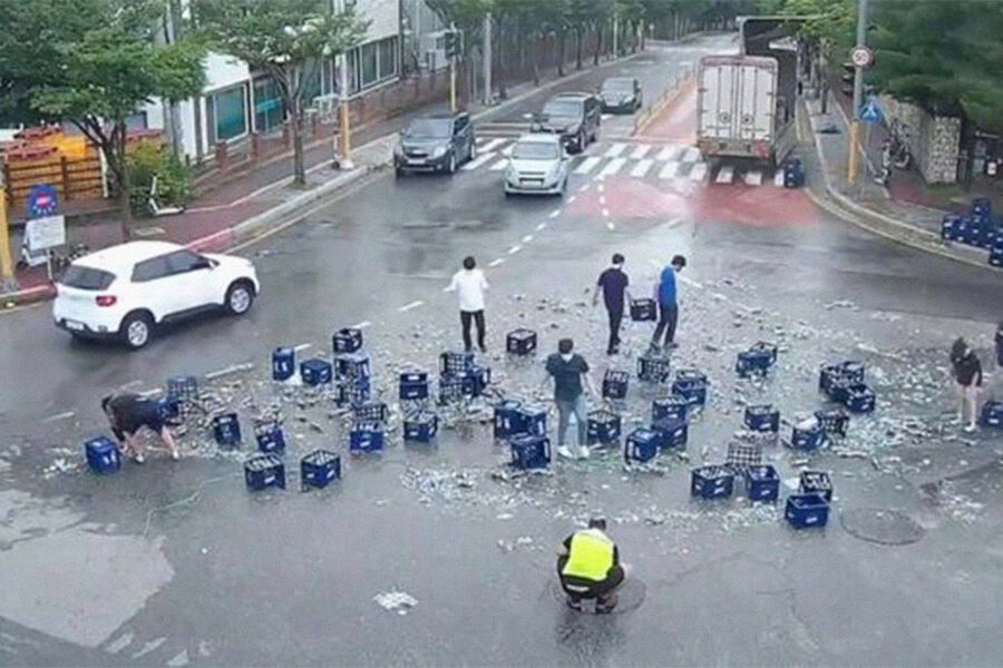 По данным СМИ, авария произошла в 50 километрах от Сеула и спровоцировала большую пробку. 2000 бутылок пива, которые находились в прицепе фуры, оказались разбитыми на асфальте, создав пенное озеро. Водитель грузовика кинулся собирать остатки груза, когда к нему на помощь подоспели очевидцы.